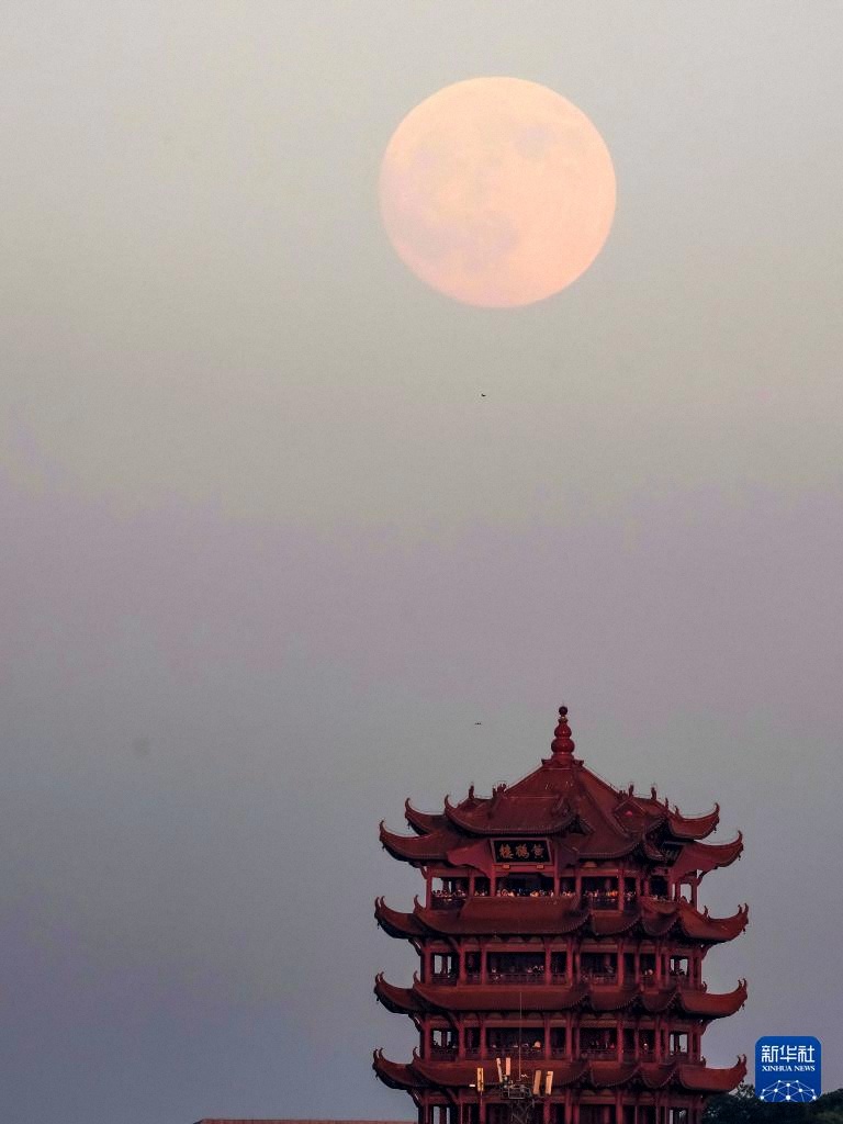 10月6日在湖北武汉黄鹤楼拍摄的月亮。新华社发(周国强摄)