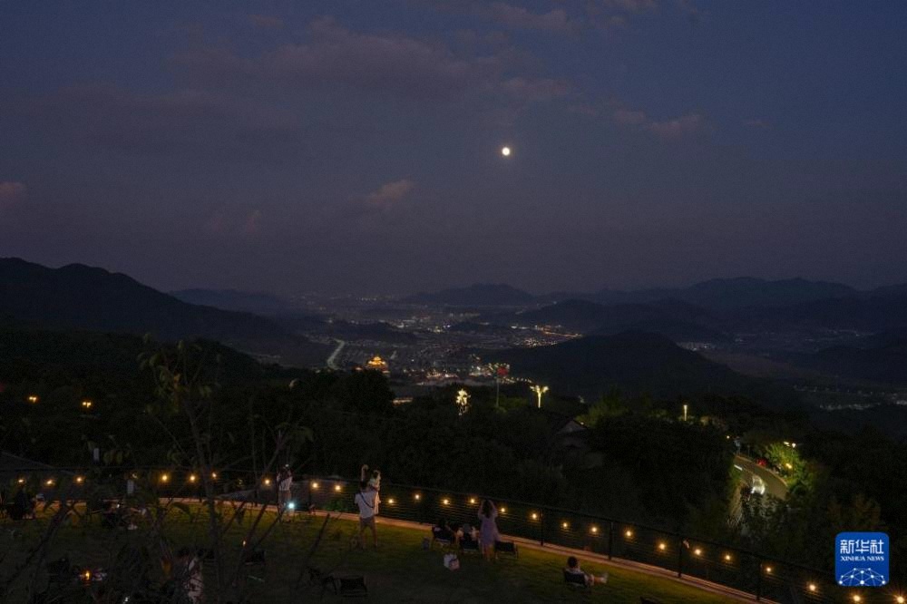 10月6日,游客在浙江省宁波市奉化区溪口镇东山村一处观景平台赏月。新华社记者 黄宗治 摄