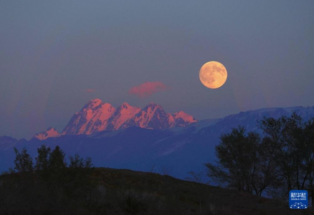 10月6日在新疆乌鲁木齐拍摄的天山山脉上空的中秋圆月。新华社记者 徐宏岩 摄