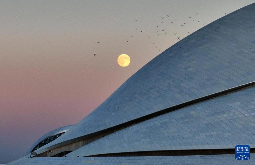 10月6日在黑龙江省哈尔滨大剧院拍摄的中秋满月(无人机照片)。新华社发(张树摄)