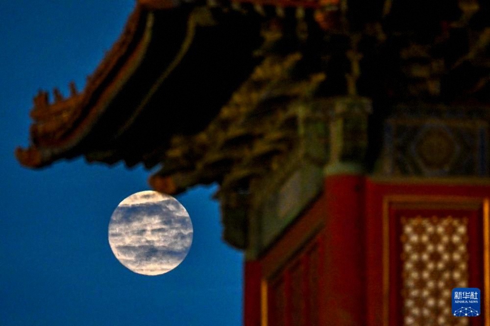 这是10月6日在北京故宫角楼附近拍摄的月亮。新华社记者 刘金海 摄