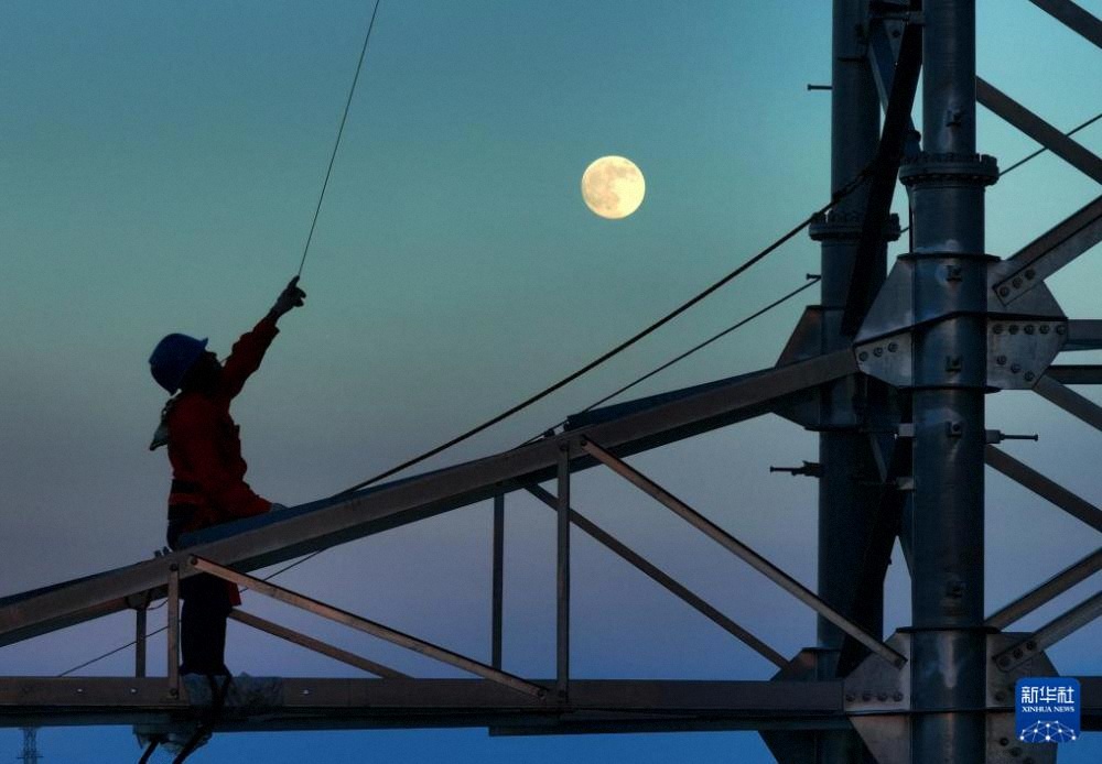 10月6日,在湖南省衡阳市雁峰区,高塔架线工人在月光的映射下施工(无人机照片)。新华社发(曹正平摄)