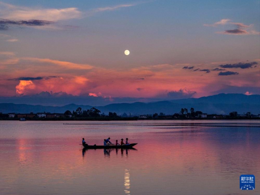 10月6日,人们乘船在云南大理洱源西湖赏月(无人机照片)。新华社发(罗新才摄)