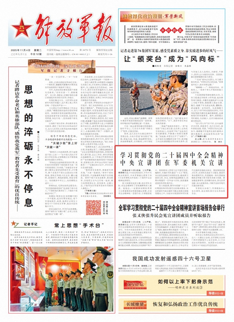 解放军报北京11月3日电 记者严珊、熊思琦报道:中央宣讲团成员、中共中央政治局委员、中央军委副主席张又侠3日在军委机关作党的二十届四中全会精神宣讲报告。