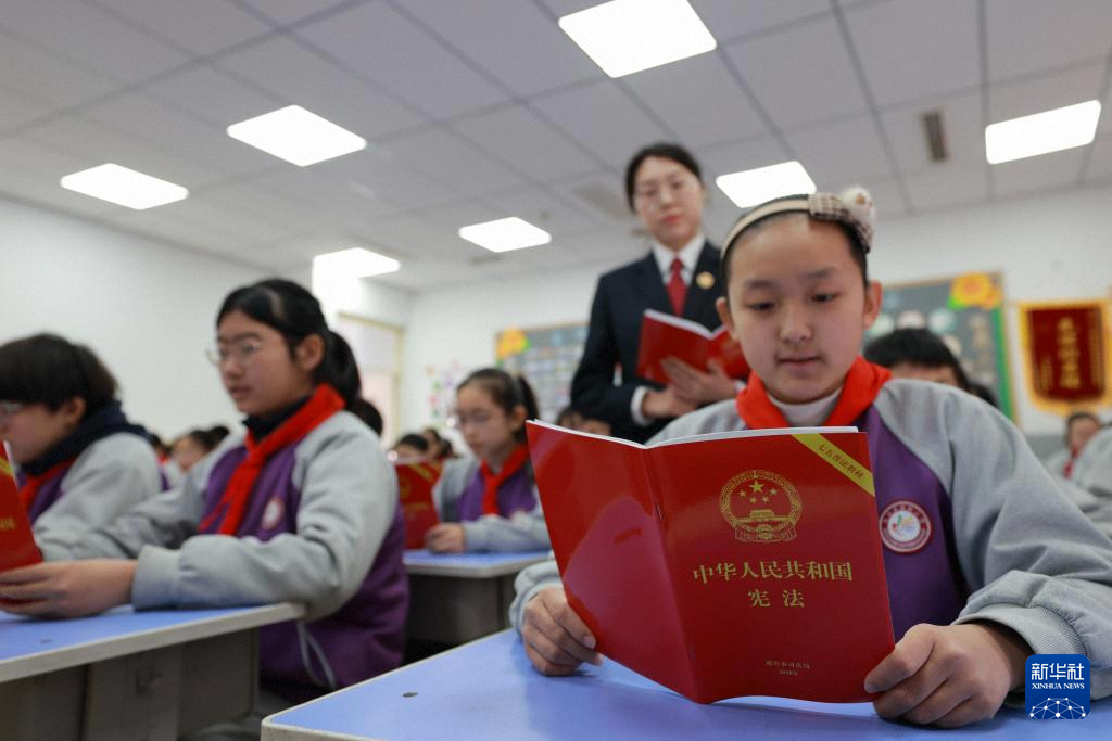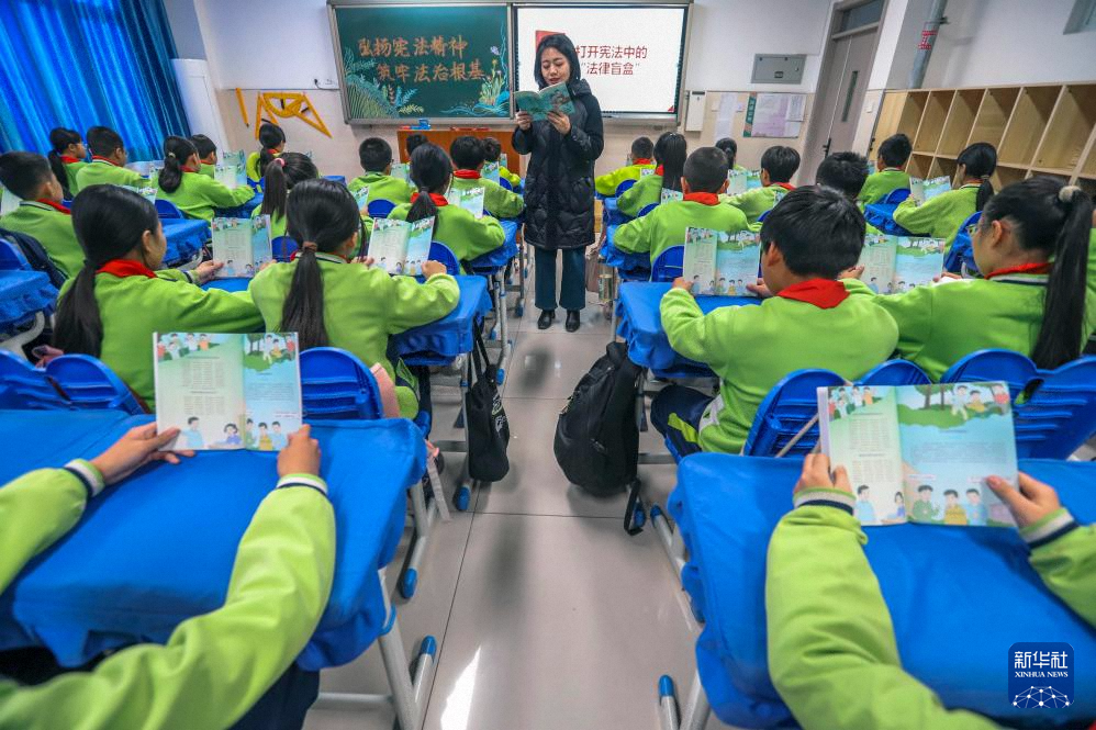 12月2日,在河北省邢台市内丘县朝阳小学,内丘县人民检察院检察干警为学生讲解宪法知识。新华社发(刘继东摄)