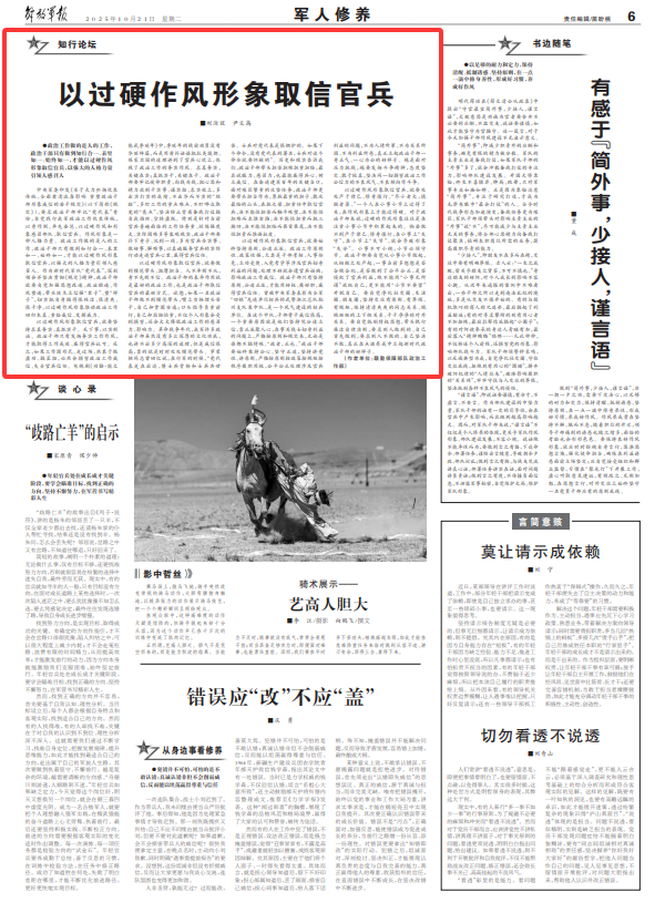 ●政治工作做的是人的工作,政治干部只有做到知行合一、表里如一、始终如一,才能以过硬作风形象取信官兵,以强大的人格力量引领人感召人
