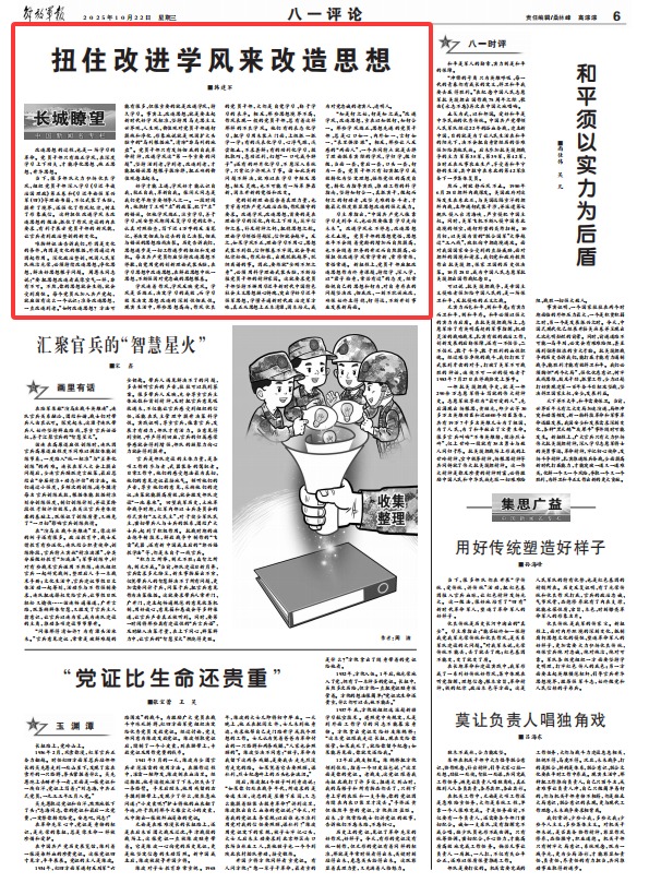当下,很多部队大力弘扬优良学风,组织党员干部深入学习《习近平谈治国理政》第五卷和《习近平论强军兴军(四)》等理论书籍,不仅武装了头脑、提升了境界,还强化了作风纪律、树立了形象威信。这种扭住改进学风来改造思想的做法,抓住了作风建设的内在要求,有利于展示党员干部的新风貌,让官兵看到政治整训的新变化。