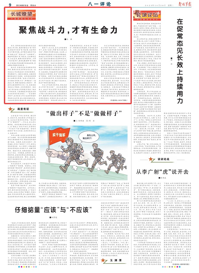 归正立牢向战为战导向,要校准政治工作的“战位坐标”。在抗美援朝战场上,政治干部与军事干部共同研究“坑道作战”心理疏导方案,将思想政治工作嵌入战术执行细节;在南海维权行动中,舰艇部队的政治教育模块与作战流程深度融合,实现战斗意志与战斗技能的同步提升。实践证明,政治工作一旦偏离战场需求,就会成为“无根之木”;唯有紧扣实战脉搏,才能焕发生命力。当前,应认真查找解决影响制约战斗力提高的深层次矛盾问题,彻底清理不符合战斗力标准的工作思路和陈规陋习,坚决砍掉与战斗力关系不大的活动项目,确保政治工作聚焦能打胜仗来筹划展开,围绕能打胜仗来推进落实,依据能打胜仗来检验评估,形成有利于提高战斗力的舆论导向、工作导向、用人导向、政策导向。