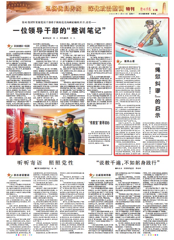 部队各级持续深化政治整训,最重要的一条经验就是要坚持问题导向。广大党员尤其是领导干部要做到“绳愆纠谬”,切实找准突出矛盾问题,把自己摆进去,敢于揭短亮丑,勇于肃毒除弊,这样才能持续纯正部队风气,推进政治整训走深走实,凝聚起新征程奋斗强军的磅礴力量。