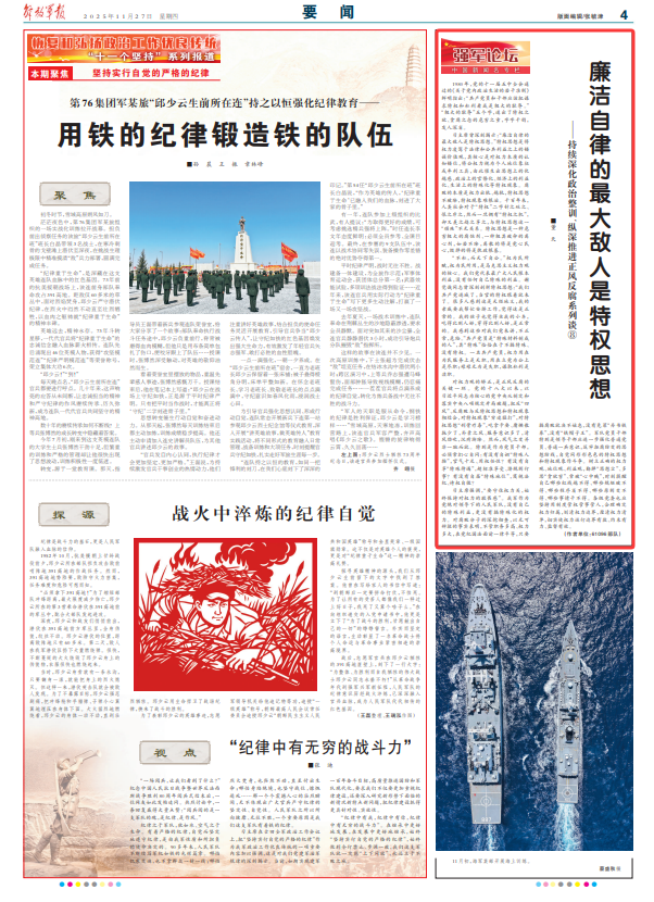 习主席强调,“要守住权力关,始终保持对权力的敬畏感”。我军作为党绝对领导下的人民军队,没有自己的特殊利益,更没有搞特殊化的权力。对腐败分子的深挖彻查,以无可辩驳的事实表明,不管职务多高、权力多大,在党纪国法面前一律平等,只要搞腐败就决不姑息,没有免罪“丹书铁券”,没有“铁帽子王”。军队党员干部特别是领导干部应进一步强化普通党员、普通一兵意识,筑牢拒腐防变的思想防线,自觉同形形色色的特权思想和特权现象作斗争。树立正确的权力观、地位观、利益观,勤掸“思想尘”、多思“贪欲害”、常破“心中贼”,时刻提醒自己哪些红线越不得、哪些规矩破不得、哪些程序省不得、哪些原则变不得、哪些事情干不得。各级党委也应坚持用制度管权管事管人,合理确定权力归属,划清权力边界,厘清权力清单,切实使权力运行边界有数、约束有力、监督有效。