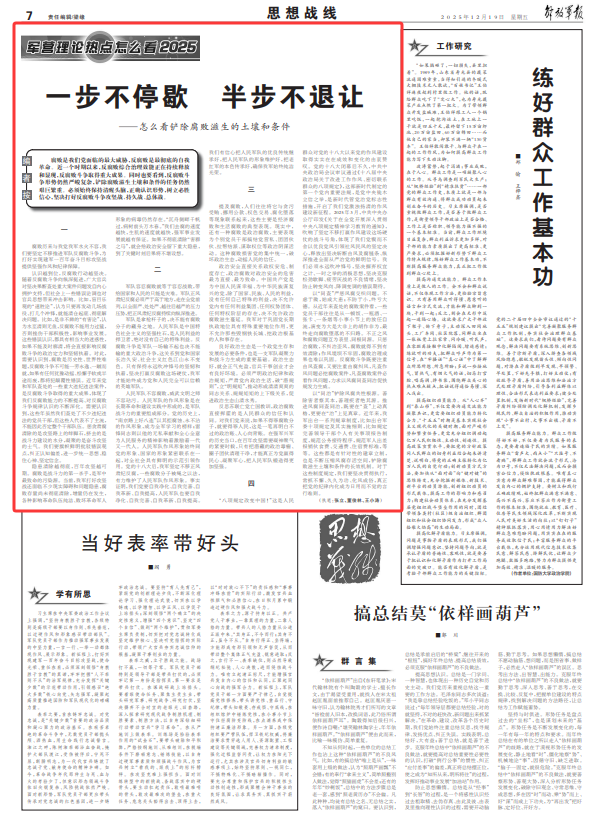 “八项规定改变中国!”这是人民群众对党的十八大以来党的作风建设取得实实在在成效和变化的由衷赞叹。党的十八大闭幕后不久,中共中央政治局会议审议通过《十八届中央政治局关于改进工作作风、密切联系群众的八项规定》,这部新时代制定的第一个党内重要法规,是党中央徙木立信之举,是新时代管党治党标志性措施,开启了我们党激浊扬清的作风建设新征程。2025年3月,中共中央办公厅印发《关于在全党开展深入贯彻中央八项规定精神学习教育的通知》,吹响了坚定不移打赢作风建设这场硬仗的战斗号角,体现了我们党锲而不舍以优良党风引领社风民风的坚定决心,释放出坚决斩断由风及腐链条、纵深推进全面从严治党的鲜明信号。我们必须永远吹冲锋号,坚决摒弃权宜之计、一时之举的消极思想,坚决克服松劲歇脚、疲劳厌战的不良情绪,坚决防止转变风向、降调变调的错误期待。
