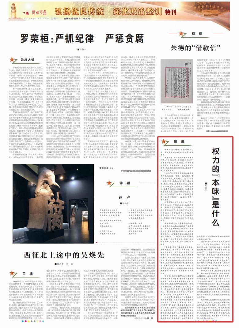 《菜根谭》中讲:“醲肥辛甘非真味,真味只是淡。”做菜讲究“淡出真味”,其实权力也如此。共产党人“没有自己的特殊利益”;权力的滋味,是为人民服务的责任,而非一己一私之快意;是大公无私、先公后私的恢廓大度,而非擅权专断、我行我素的顾盼自雄;是敝裘羸马、力疾从公的担当,而非闭门酣歌、得荫忘身的恣肆……秉持这种权力观的共产党人,恒河沙数,盈千累万,让人民信服。