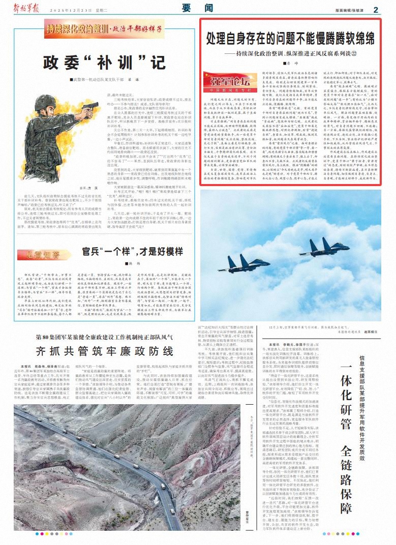 习主席强调:“对自身存在的问题不能反应迟钝,处理动作慢腾腾、软绵绵,最终人亡政息”。正风肃纪反腐是管党治党的重要抓手,而一些党员干部对自身问题“反应迟钝、整改迟缓、失之于软”,表面上看是行动拖沓、执行不力,实则是政治意识淡薄、责任担当缺失、斗争精神弱化的表现。这不仅无益于自身的成长进步,不利于问题的顺利解决,更会损害党和军队的事业发展,必须坚决破除。