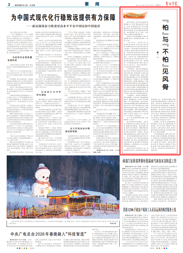 习主席深刻指出,领导干部工作上要大胆,用权上则要谨慎,常怀敬畏之心、戒惧之意,自觉接受纪律和法律的约束。这告诫我们,既要有“不怕”的精神,又要有“怕”的意识。新时代新征程,在该“怕”的地方心存敬畏、严守底线,在该“不怕”的地方挺身而出、敢于斗争,是一名共产党人应有的作风、必须的行动。