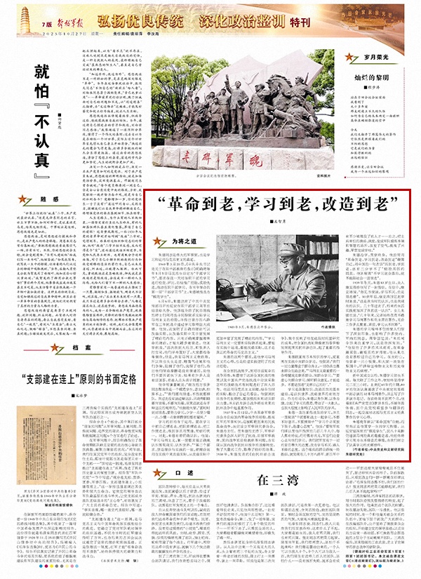 他非常谦虚地说:“前方后方很多同志都说我是一个模范学生,老实讲,怕算不上。”“我们要向前进,不然就要掉队。我过去没有读过辩证法,只晓得眼睛要向前看,不要向后看,原来这就是合乎辩证法的规律的。”他勉励大家,“要时时刻刻前进,要努力学习,少学一点便少懂一点,少懂一点做事情便怕要有漏洞。”
