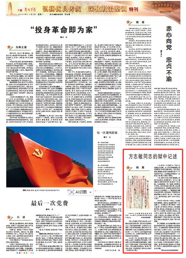 除了胡逸民,被方志敏顽强斗志和坚定信仰感召的,还有监狱文书高家骏等人。方志敏在狱中完成的手稿就是通过他们,分批传了出来。在入狱的100多天里,方志敏写了《我从事革命斗争的略述》《可爱的中国》《死!——共产主义的殉道者的记述》《清贫》《狱中纪实》等16篇文稿,现存13篇。1935年8月6日凌晨,年仅36岁的共产主义战士方志敏,为革命事业流尽了最后一滴血。他用生命凝结而成的文字激励着一代代人,他的光辉形象永远在人们心中闪耀。