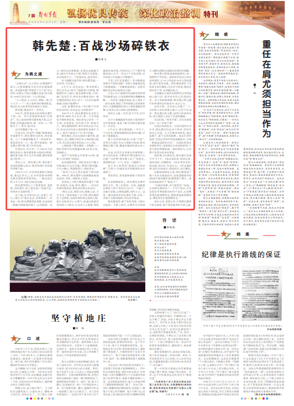 百战沙场碎铁衣。从班长到军区司令员,韩先楚历任近40个职务,所经历的岂止百战。让人印象深刻的是,他总是敢于、善于出奇招险棋。战友们评价他是“灵活运用我军传统战略战术,不拘一格地创造新的打法”。而他的那些出奇制胜背后,是细致扎实的战场研判、千思万虑的部署推演。他的敢担当,从来都不是莽夫的冲动冒进。