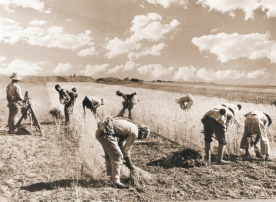 1943年夏,驻守滹沱河畔的我军某部官兵帮助群众收割麦子。