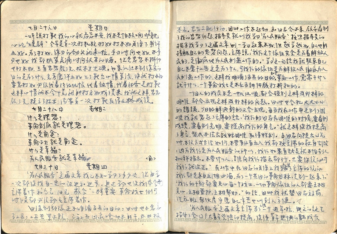 1965年7月14日,王杰组织民兵开展埋排雷训练时,面对突发意外,奋不顾身扑向即将爆炸的炸药包,保护了现场12名民兵和人武部干部,献出了年仅23岁的宝贵生命。战友们整理王杰遗物时,发现了他写的10多万字的日记。这些日记的字里行间,闪耀着精神光芒:“牢记:在荣誉上不伸手,在待遇上不伸手,在物质上不伸手。”“什么是理想,革命到底就是理想;什么是前途,革命事业就是前途;什么是幸福,为人民服务就是幸福!”这些滚烫的字眼,如同铮铮誓言,让人们追寻到王杰在关键时刻挺身而出的思想根基。