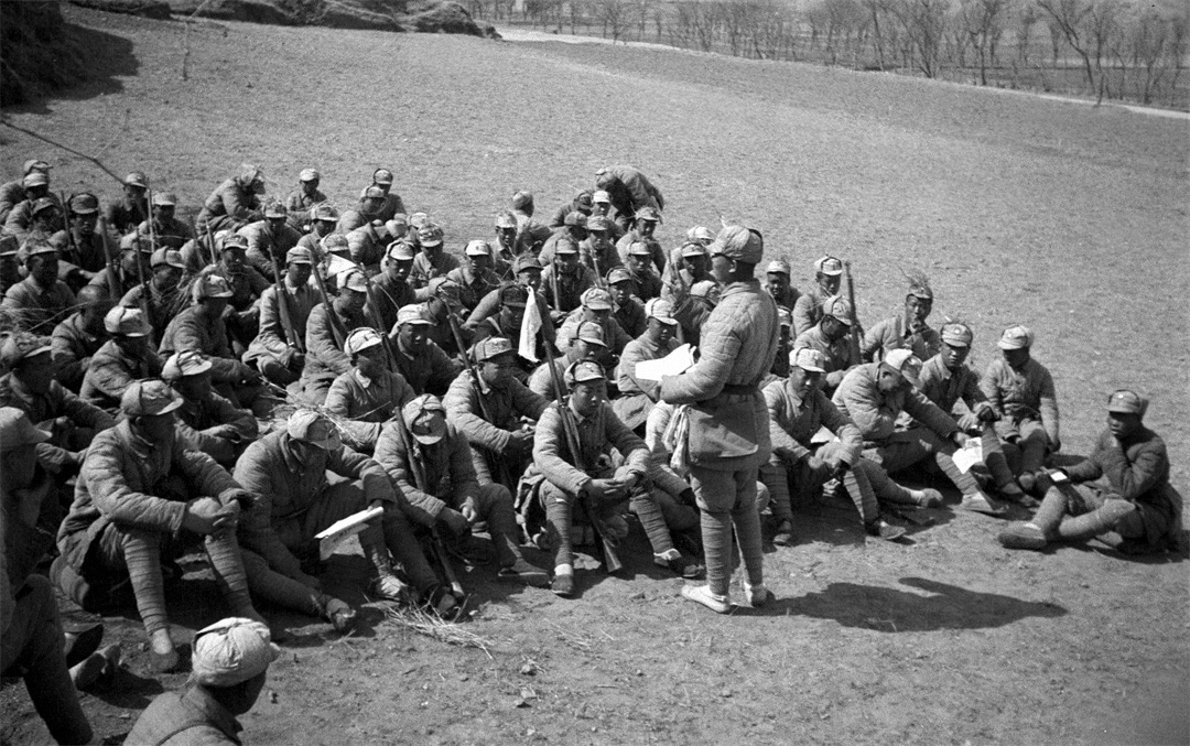 延安整风运动中,部队连以下单位进行正面教育。这是某部指导员给战士们讲课。