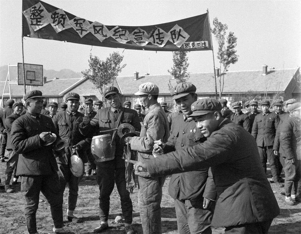 一个是一张照片呈现的“活泼的整训宣传,活跃的整训气氛”——1960年,某部宣传队在宣传整顿军风纪的重要性。