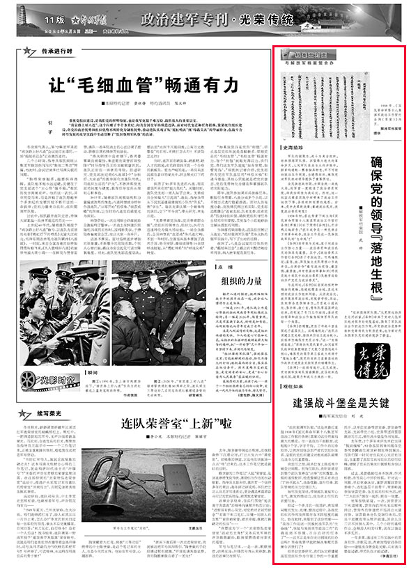 “组织强则军队强。”这是我最近重温1938年《国民革命军第十八集团军政治工作暂行条例(草案)》这份档案后最大的感受。在一名政治干部眼里,这短短7个字,字字千钧。工作中的切身经历,让我深刻体会到严密的党组织体系、坚强的党组织建设对提高部队凝聚力战斗力的重要性。