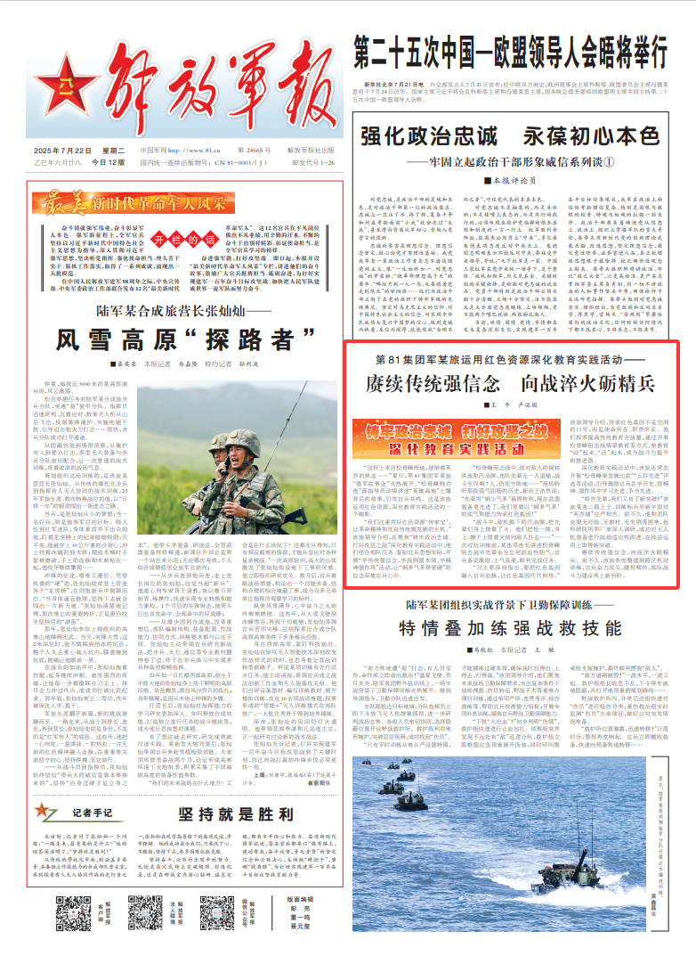 “我们注重用好红色资源‘传家宝’,让革命精神和优良传统焕发新的生机。”该旅领导介绍,在聚焦“铸牢政治忠诚、打好攻坚之战”深化教育实践活动中,他们结合部队任务、紧贴官兵思想实际,开展“学传统强信念、学战例强本领、学精神强作风”活动,让“钢多气多骨更硬”的信念深植官兵心中。