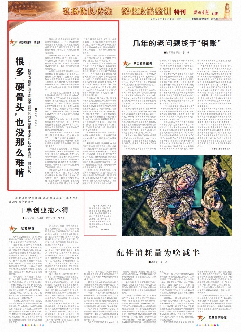 “一些基层建设问题,从根源上说是思想问题。”深化政治整训期间,上级机关工作组深入该部,剖析查摆不足、纠治顽瘴痼疾。“越是困难阶段,领导干部越要担起使命,问问自己能不能横下心来打攻坚战,敢不敢拎着‘乌纱帽’干事创业。”带队领导的话一针见血,触动了该部党委一班人。