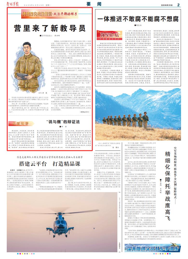 刚来营队,不爱说话,参加班务会时听得多、说得少;时间久了,行动在先,人人点赞“多动手少动口”的作风。官兵对新教导员印象的转变,蕴含着政治工作“说与做”的辩证法。