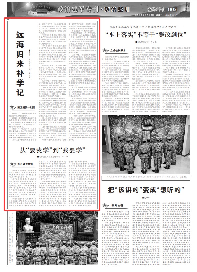 让我感触最深的是,领导干部这个“关键少数”确实在带头学习。以前也要求领导干部带头学,但很多时候是“要我学”。深化政治整训中,领导干部主动端正学风,把学习当成一种责任、一种需求、一种习惯。像这样任务归来主动补课、带着问题钻研的例子,在我身边越来越多。在党委理论学习中心组学习时,很多领导干部不再一味念稿子、读文件,而是把自己摆进去,谈认识、谈体会、谈如何在工作中落实。这种变化,官兵们都看在眼里,也开始真学真信,自觉加强思想淬炼。