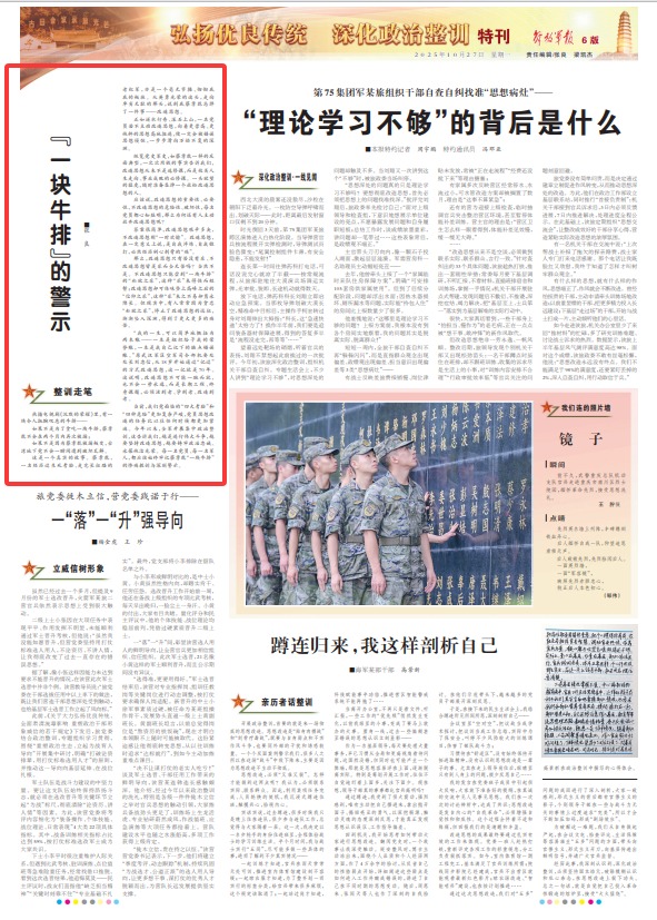 当前,我们党面临的“四大考验”和“四种危险”更加复杂严峻,党员思想改造的任务比以往任何时候都更加紧迫。今年以来,全军开展集中政治整训,这告诉我们,越是进行伟大斗争,越要坚持改造思想,越要铸牢政治忠诚、永葆纯洁光荣。每一名党员、每一名军人,都应该始终牢记蔡孝乾“一块牛排”的惨痛教训与深刻警示。