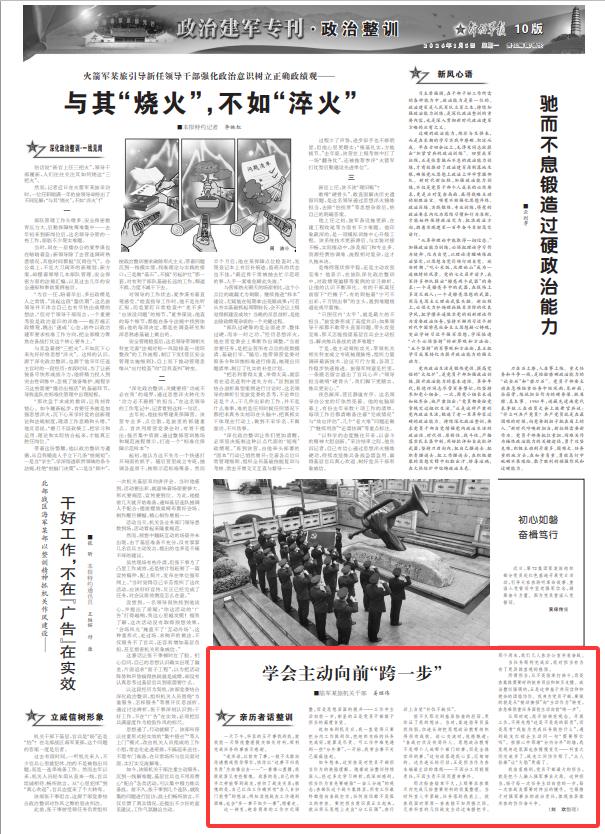 所谓担当,从不是指单打独斗,而是在集体需要时的挺身而出和相互支撑。政治整训强调的,正是这种基于共同信仰和使命的团结协作。我身为党员干部,要做的就是从“被动接招”向“主动作为”转变,在急难险重任务面前主动向前“跨一步”。