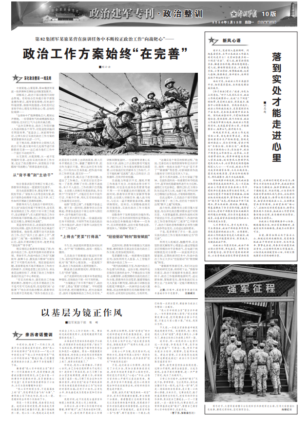 纵观我军历史,政治工作走进官兵心里,首先要实事求是。新泉整训肃清非无产阶级思想,靠的是面对面谈心、实打实纠错,官兵才明白“为谁扛枪、为谁打仗”,凝聚起 无往不胜的向心力;长征途中,政治干部身先士卒爬雪山、过草地,立身为旗带动队伍,将革命理想自然融入官兵血脉;延安整风从整顿学风党风文风入手,让实事求是的思想路线深入人心……可以说,政治工作作为我军的看家本领,立足点越具体,落实成效越显著,官兵信仰就越坚定,部队凝聚力、战斗力也就越强。