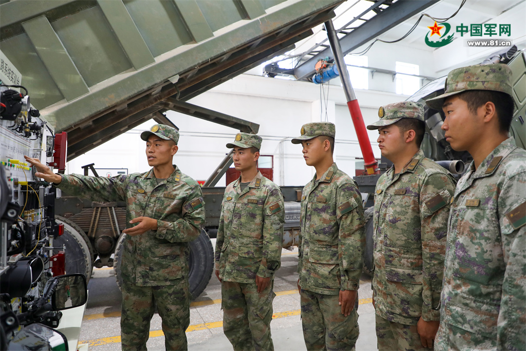 雷耀明(左一)向年轻战友讲解装备原理。马新周摄