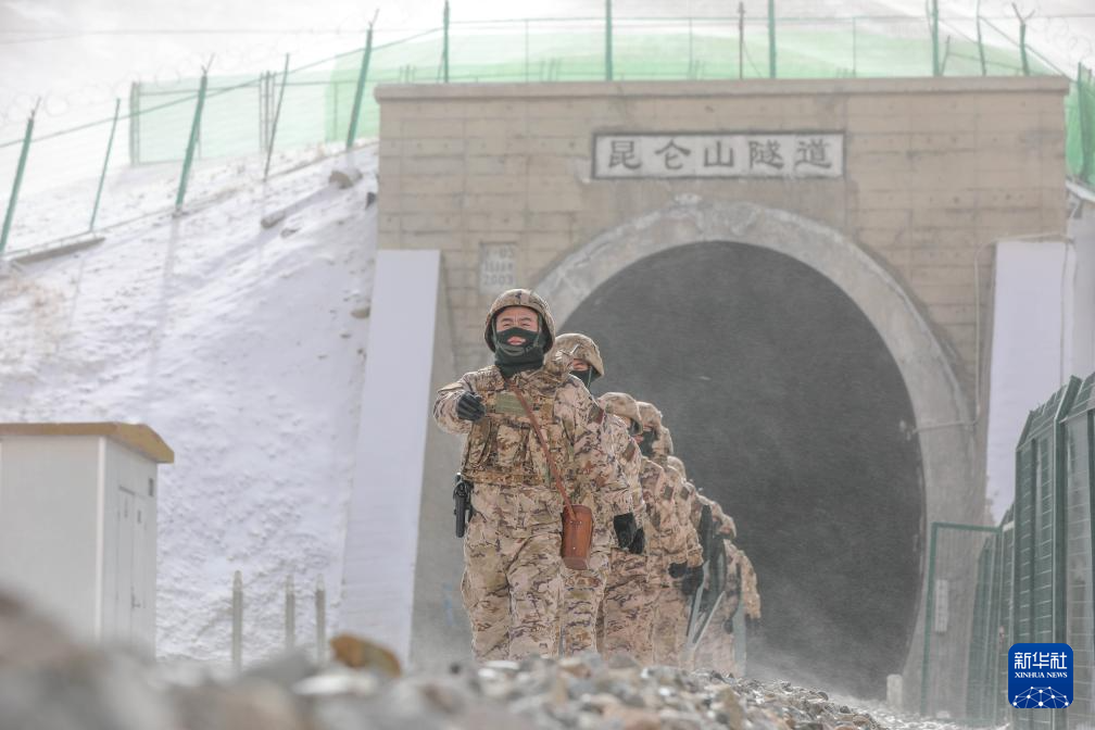 2月16日,在海拔近5000米的昆仑山北麓无人区,武警青海总队海西支队官兵冒着严寒在青藏铁路昆仑山隧道执行巡逻任务。