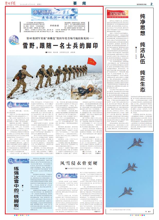 习主席强调,要突出锤炼作风,从实战需要出发从难从严摔打部队,发扬一不怕苦、二不怕死的战斗精神,敢于战胜一切困难,敢于压倒一切敌人。大雪满弓刀,砺兵正当时。连日来,许多部队陆续奔赴茫茫雪野,科学利用严寒天气,锤炼实战能力、磨砺作风意志、砥砺血性胆气。为了反映各部队以实战为标尺,从难从严开展冬训的昂扬风貌,本版即日起推出“冰雪砺兵 来自冬训一线的报道”专栏,刊发来自冬季演兵场的报道,敬请关注。