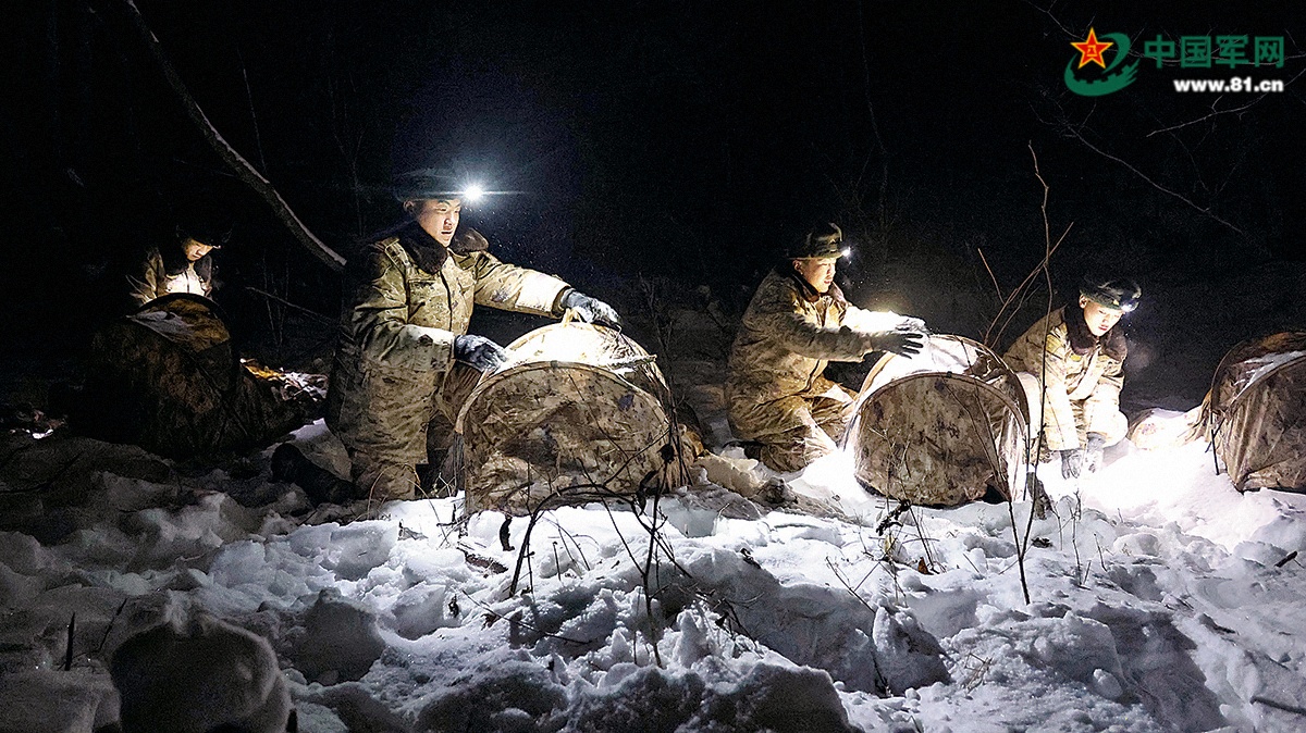 入夜之后,气温骤降。弹药分队指挥员秦强决定以野战弹药库为中心,组织官兵分散宿营。夜色中,他们根据地形地貌选定宿营点位,随后点亮头灯,快速清理雪地上的枯枝和石块。