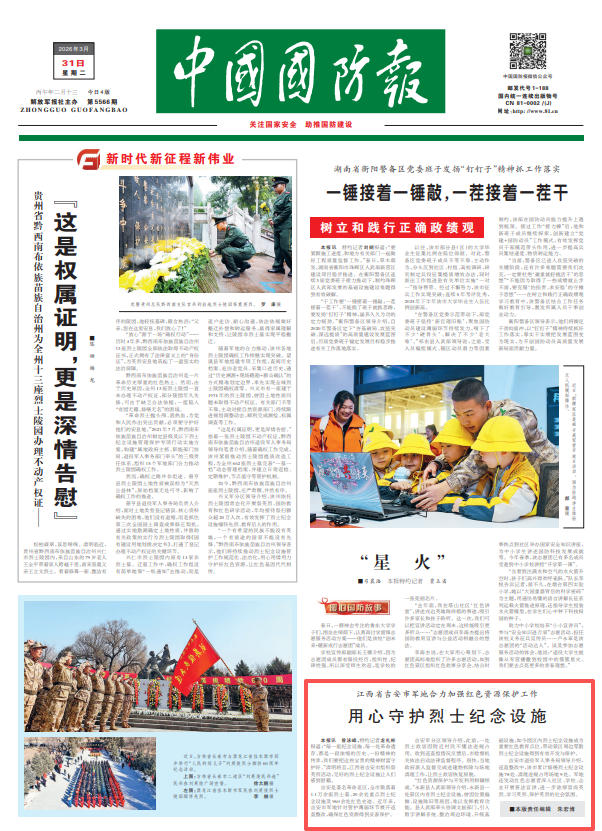中国国防报讯曾泳峰、特约记者龙礼彬报道:“每一座纪念设施、每一处革命遗存,都是一段浓缩的历史、一份精神的传承,我们要把这些宝贵的精神财富守护好。”清明将至,江西省吉安市组织祭英烈活动,完好的烈士纪念设施让人们感到慰藉。