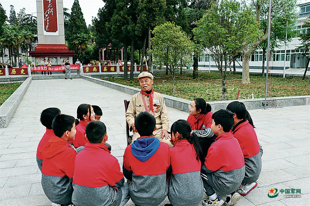 清明节前夕,河南省内乡县人武部邀请抗美援朝老兵在烈士陵园为学生讲述战斗故事。张宏果 摄