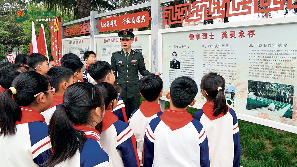 “申亮亮班”第3任班长汤宏华正在给前来烈士陵园祭扫的温县城内小学的学生们讲述“人民英雄”申亮亮的事迹。解放军报记者 汪飞 摄