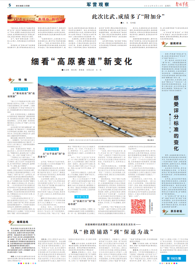 变化悄然发生,又势不可挡。如今,该支队的座座营盘里,一派生龙活虎、斗志昂扬景象。在政治整训的引领下,思战、谋战、研战的氛围愈发浓厚,官兵纷纷表示要持续推动“雪域尖兵”比武成果转化落地,一刻不停加强常态养护保通和应急抢险救援能力,打通从训练场走向战场的“最后一公里”。
