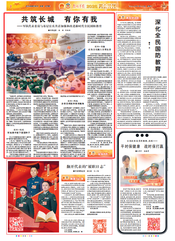 全国两会会场内外,谈及近年来加强和改进新时代全民国防教育的新风新貌,军队代表委员与基层官兵共同感到,“国防+”正在与教育、文旅等领域加强融合,汇聚成共筑全民国防钢铁长城的强大合力。