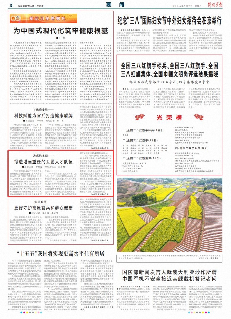 “保障官兵健康,就是保障部队战斗力。我们一定牢记姓军为战宗旨,培养政治可靠、医术精湛、作风优良的军事医疗人才。”边惠洁委员介绍,近年来,她所在的空军军医大学紧盯卫勤保障难题,在军事医学研究、战创伤救治等领域取得重要进展。越来越多军事医学科研人员“把论文写在演兵场上”,把成果应用在练兵一线,实现科研课题源于演兵场、科研成果服务演兵场。