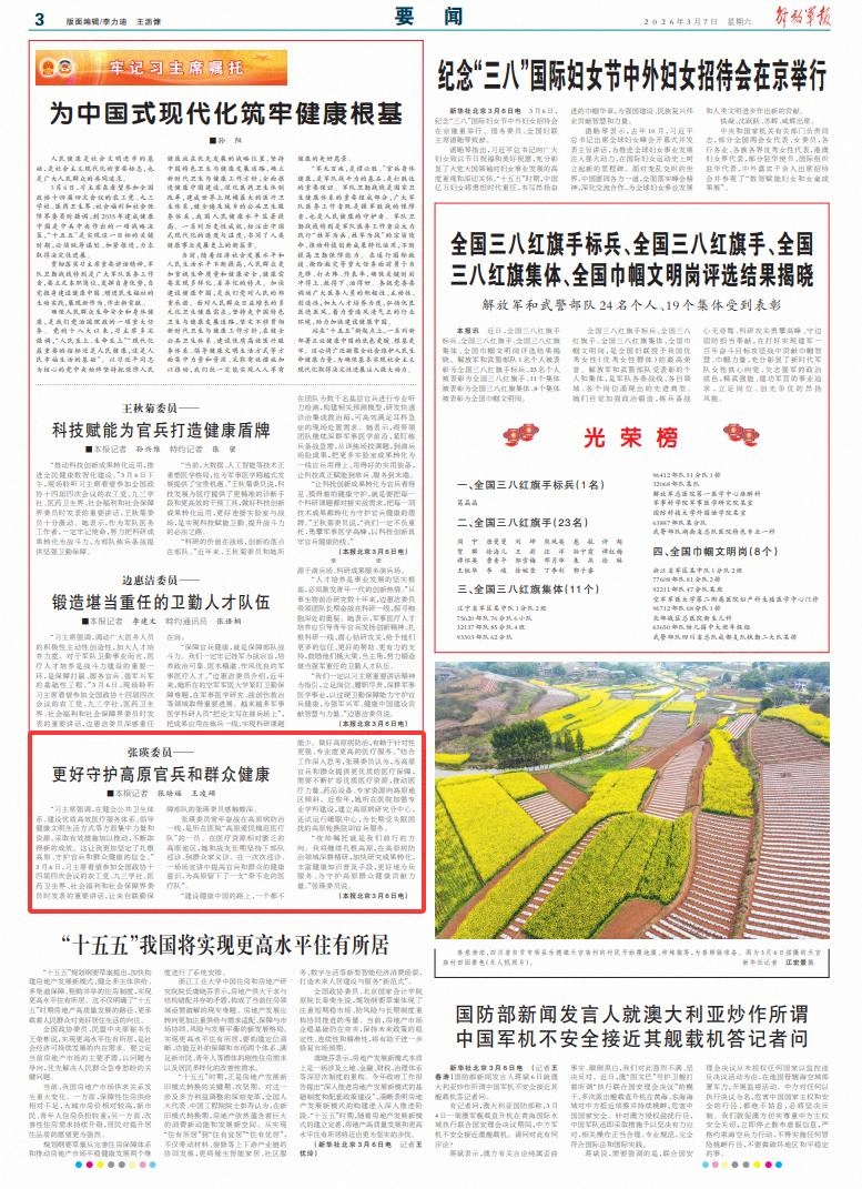 “习主席强调,在健全公共卫生体系、建设优质高效医疗服务体系、倡导健康文明生活方式等方面集中力量和资源、采取有效措施加以推动,不断取得新的成效。这让我更加坚定了扎根高原、守护官兵和群众健康的信念。”3月6日,习主席看望参加全国政协十四届四次会议的农工党、九三学社、医药卫生界、社会福利和社会保障界委员时发表的重要讲话,让来自联勤保障部队的张瑛委员感触颇深。