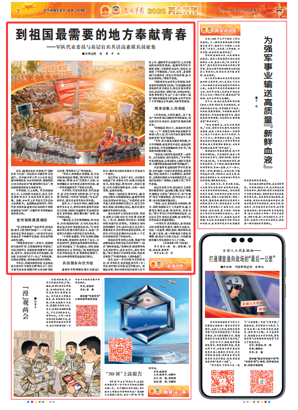 参军报国,无上光荣。军队的基础在士兵,士兵的源头在征兵,征兵工作直接影响战斗力生成和军队建设发展。当前,2026年上半年征兵工作正如火如荼展开。全国两会会场内外,军队代表委员和基层官兵畅谈如何为钢铁长城精选“好砖”,为强军兴军持续输送高素质兵员。