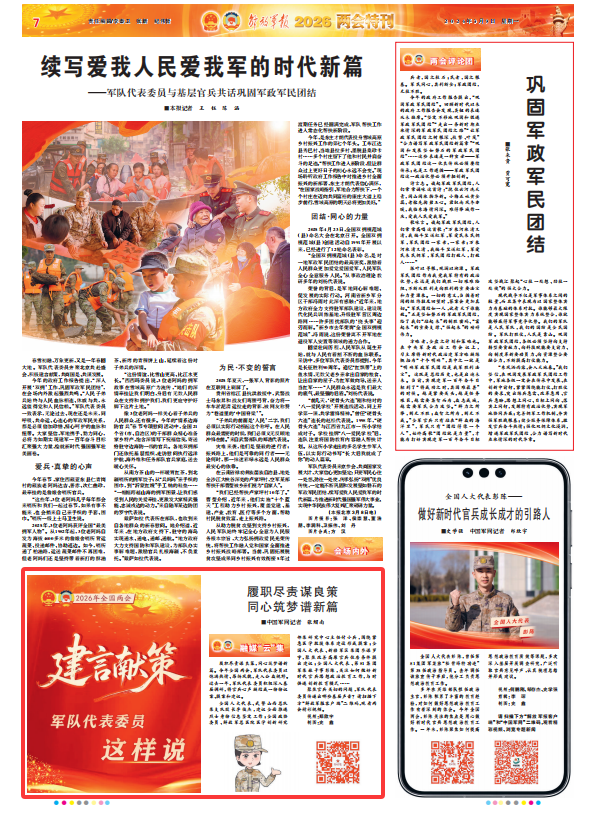 履职尽责谋良策,同心筑梦谱新篇。今年全国两会,军队代表委员以饱满热情、昂扬风貌,走入公众视野。过去一年,军队代表委员积极深入基层调研,将官兵心声凝结成一份份议案、提案和建议。