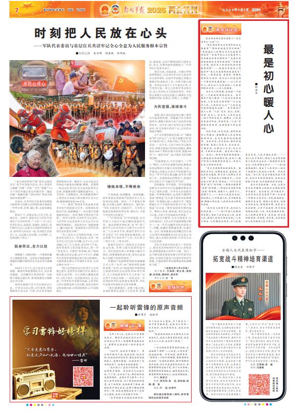 “我们是工农的子弟,我们是人民的武装……”一首《中国人民解放军军歌》,唱出了我军来自人民、依靠人民、服务人民的立场和态度;“人民子弟兵,人民嘱托记得清,为人民服务是宗旨,人民幸福我光荣……”一首《人民子弟兵》,唱出了我军官兵服务人民的矢志追求;“祖国的利益重如山,为民甘洒血和汗……”一首《爱国奉献歌》,唱出了人民军队一切为了祖国和人民的初心使命。对我军来说,“为人民”是永不褪色的赤子情怀、永远不变的价值指向、永恒追求的奋斗目标、永不枯竭的动力源泉。