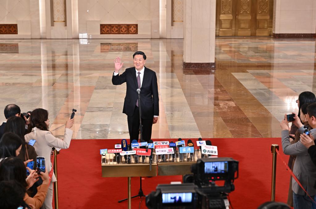 3月9日,第十四届全国人民代表大会第四次会议第二场“部长通道”集中采访活动在北京人民大会堂举行。这是农业农村部部长韩俊接受媒体采访。