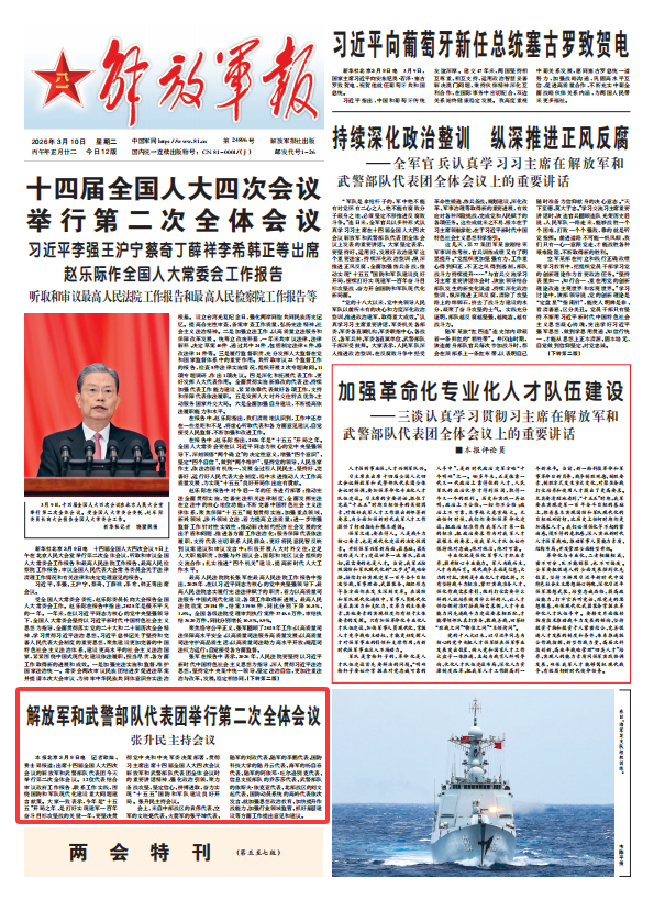 解放军报北京3月9日电 记者欧灿、费士廷报道:出席十四届全国人大四次会议的解放军和武警部队代表团今天举行第二次全体会议。12位代表结合审议政府工作报告,联系工作实践,围绕国防和军队现代化建设重大问题建言献策。大家一致表示,今年是“十五五”开局之年,是打好实现建军一百年奋斗目标攻坚战的关键一年,要坚决贯彻党中央和中央军委决策部署,贯彻习主席出席十四届全国人大四次会议解放军和武警部队代表团全体会议时的重要讲话精神,强化政治引领,聚力备战攻坚,坚定信心、拼搏进取,奋力实现“十五五”国防和军队建设良好开局。张升民主持会议。