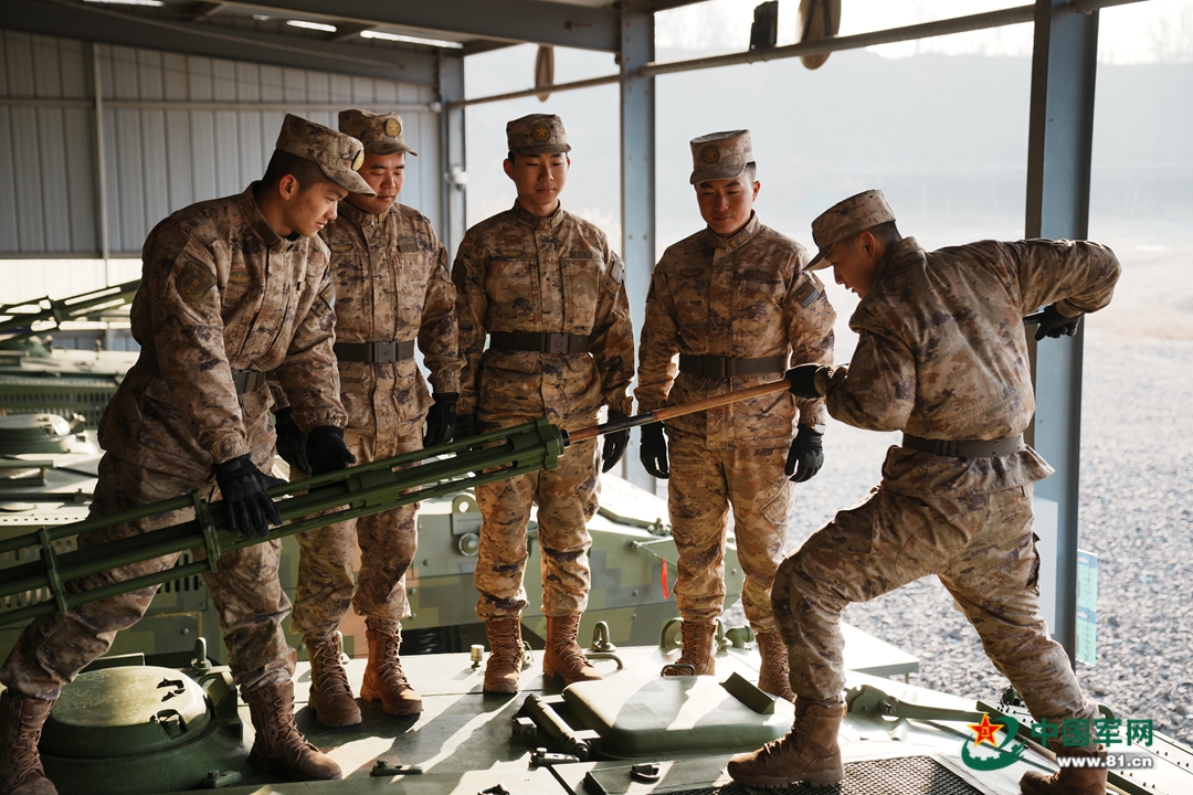 “梁山战斗英雄连”官兵清理战车炮膛。中国军网记者孙智英摄